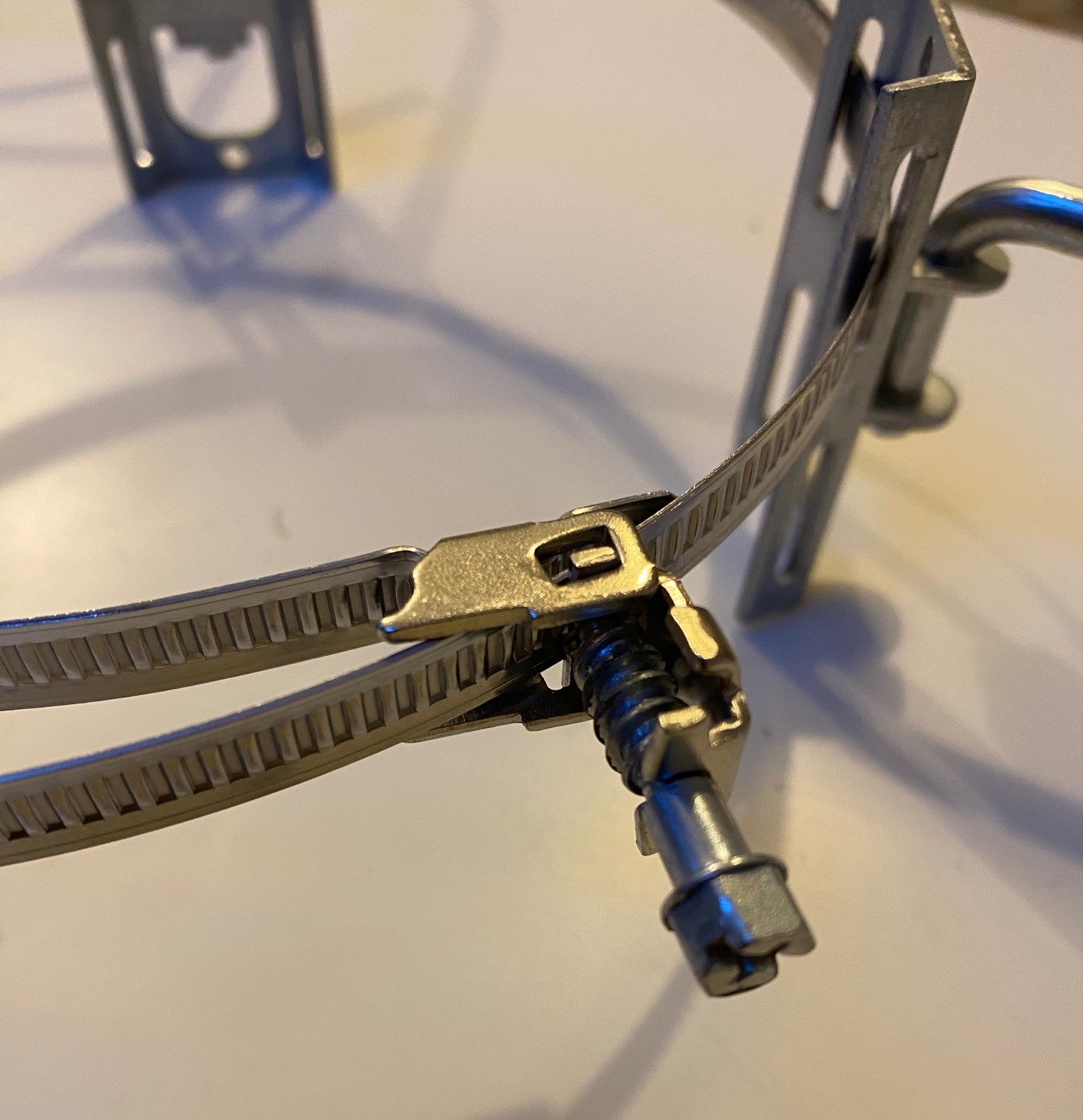 To fit, slide the 3 brackets onto the jubilee clip and space them so they equidistant to each other. Wrap jubilee clip around post and then screw tightly as shown.